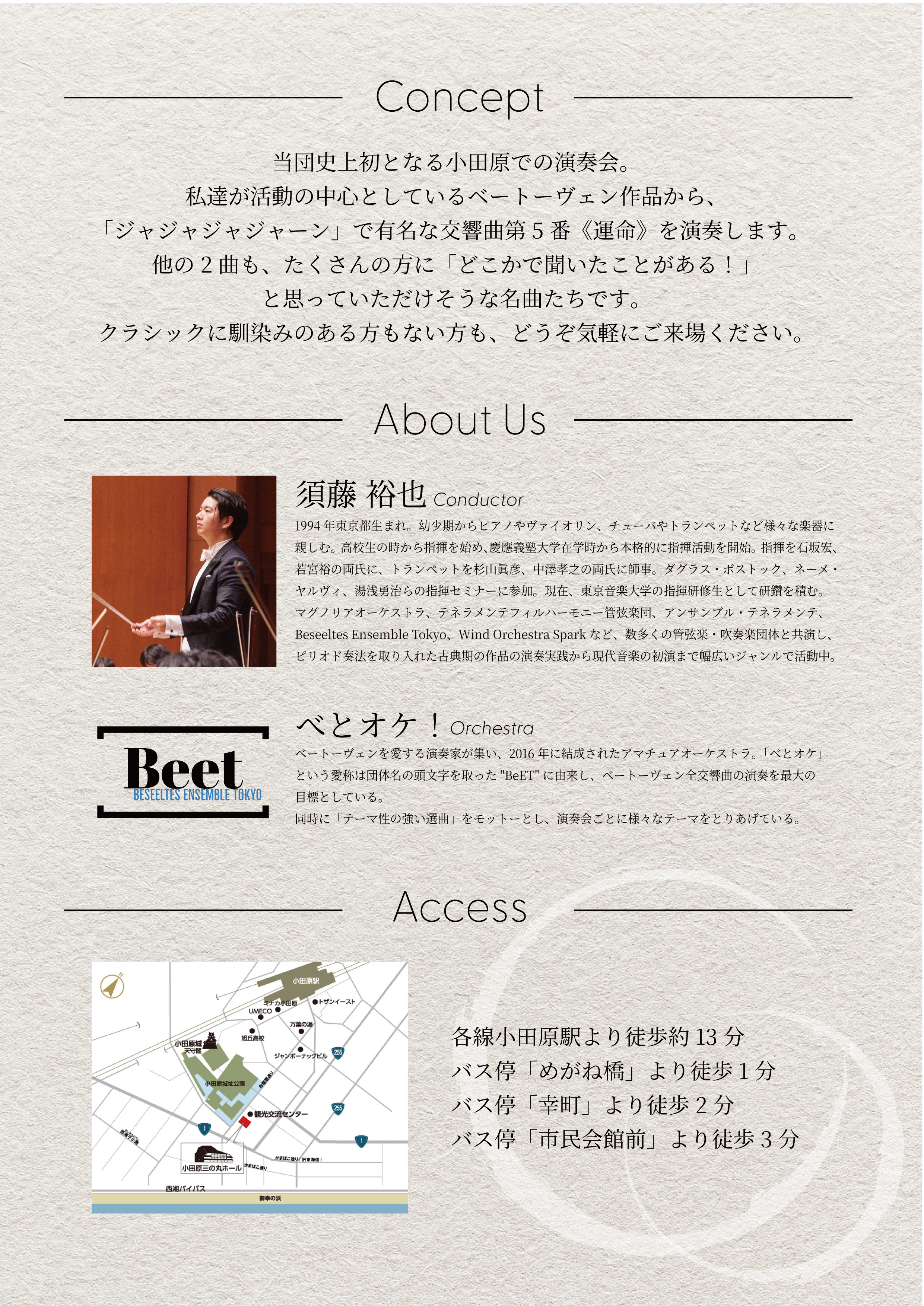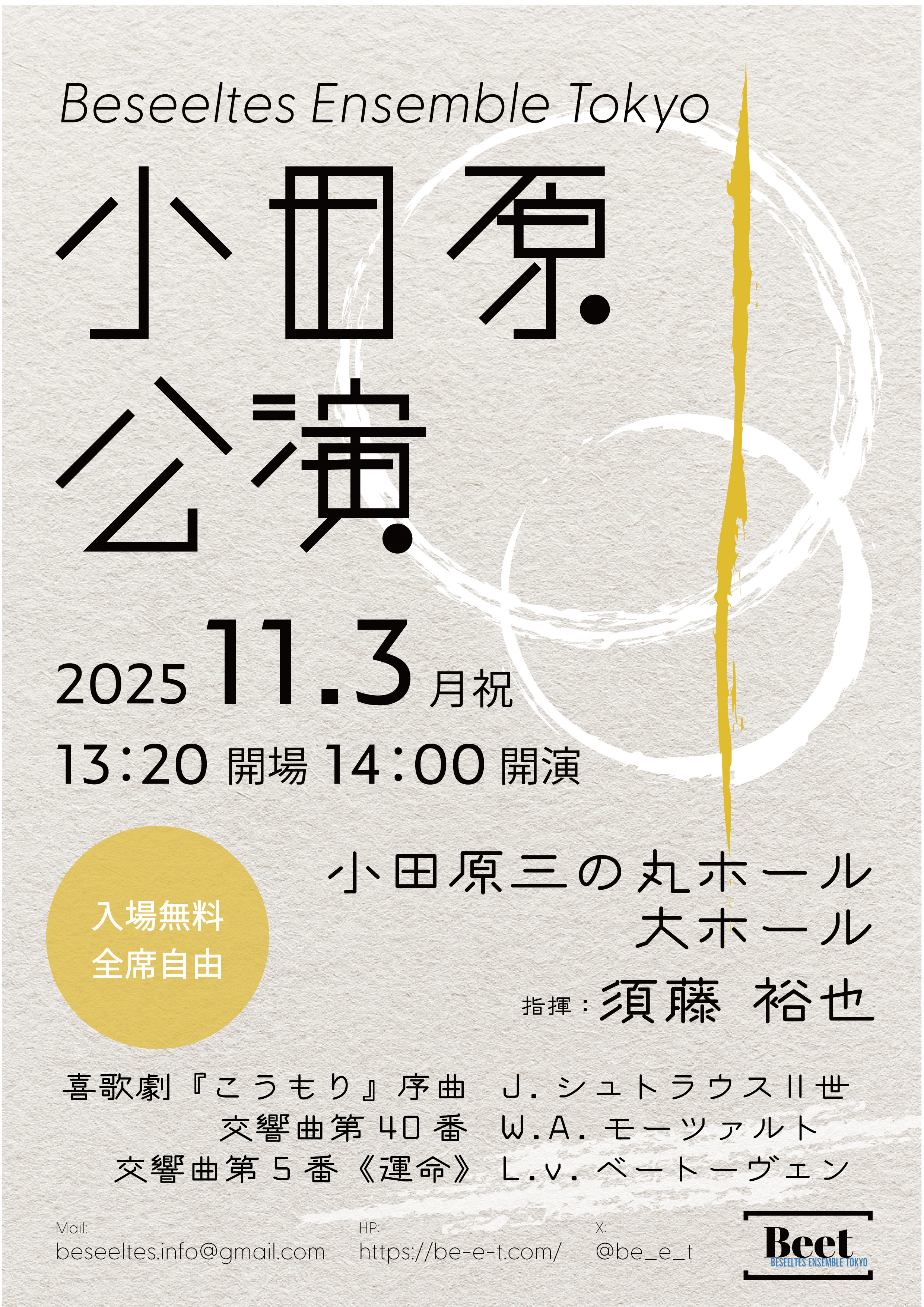 当団史上初となる小田原での演奏会。 私達が活動の中心としているベートーヴェン作品から、「ジャジャジャジャーン」で有名な交響曲第5番《運命》を演奏します。 他の2曲も、たくさんの方に「どこかで聞いたことがある!」と思っていただけそうな名曲たちです。 クラシックに馴染みのある方もない方も、どうぞ気軽にご来場ください。